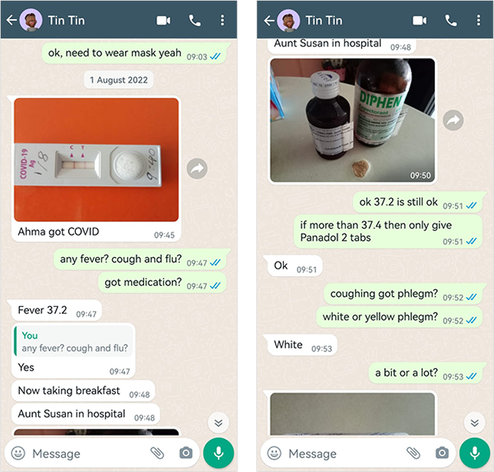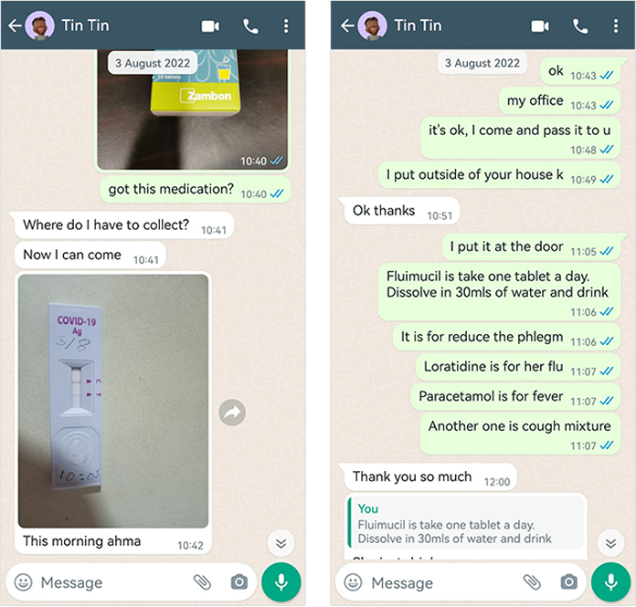Left alone to take care of Madam Koh, Tin Tin who was also infected with COVID-19 panicked and immediately texted Ms Pan via WhatsApp for help.