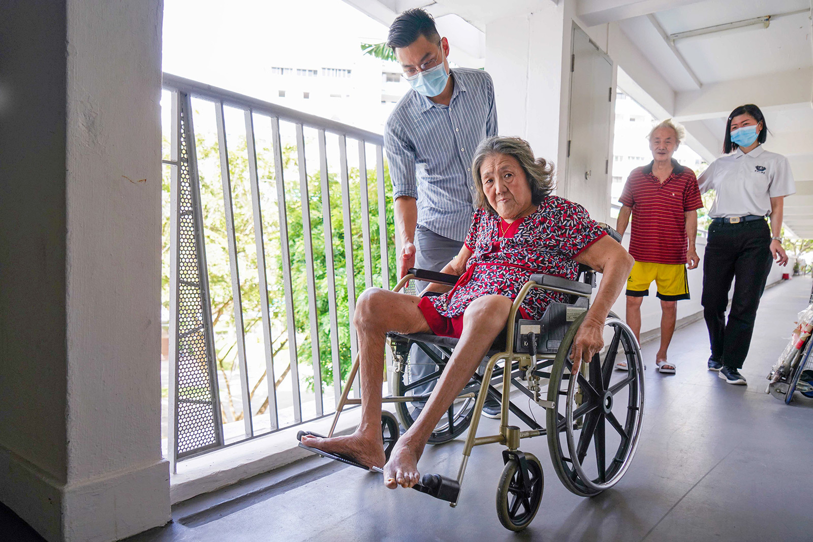Eventually, Mrs Toh made an effort to operate the wheelchair herself, and even went around the corridor on her own, regaining some motivation and confidence due to her successful movements.