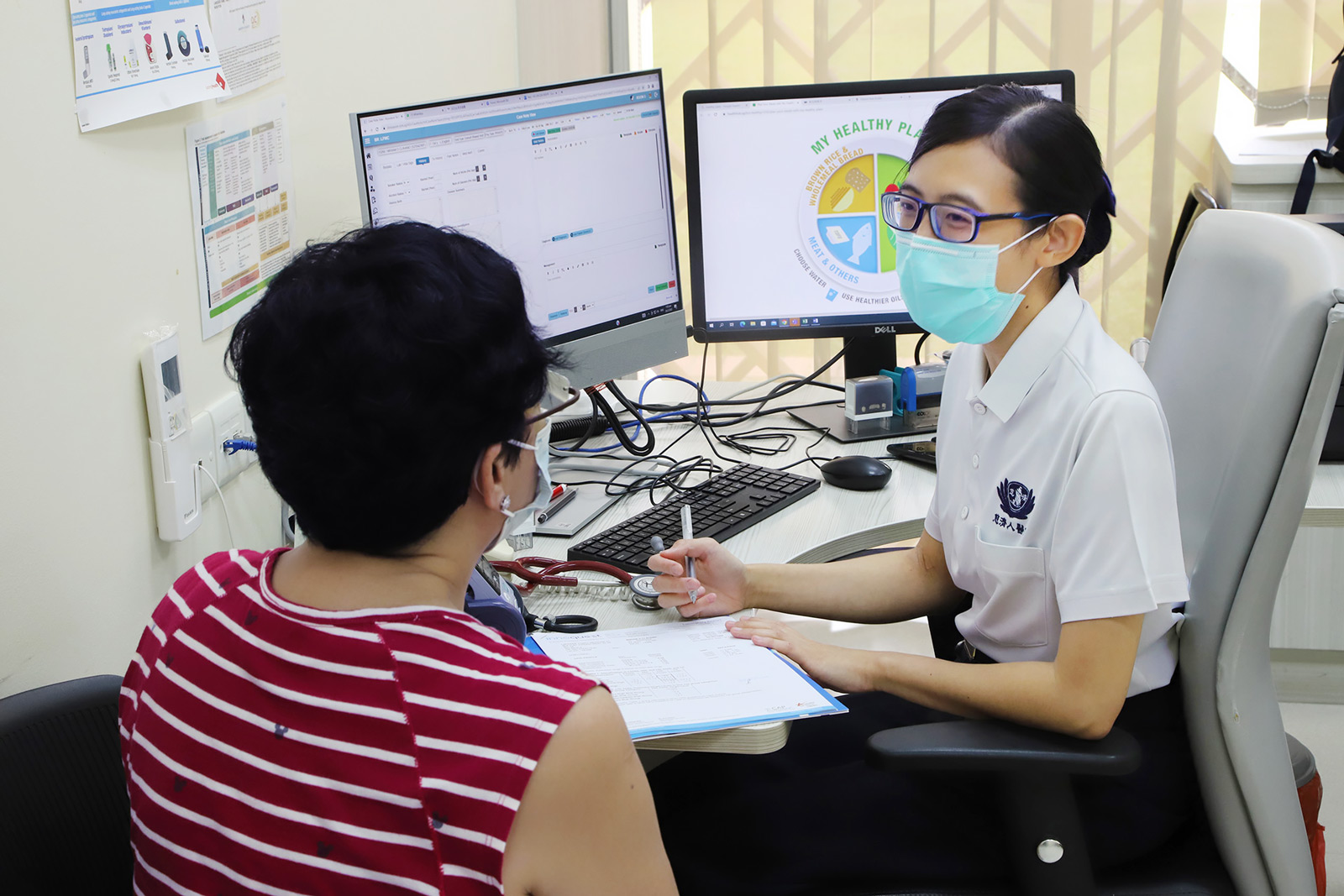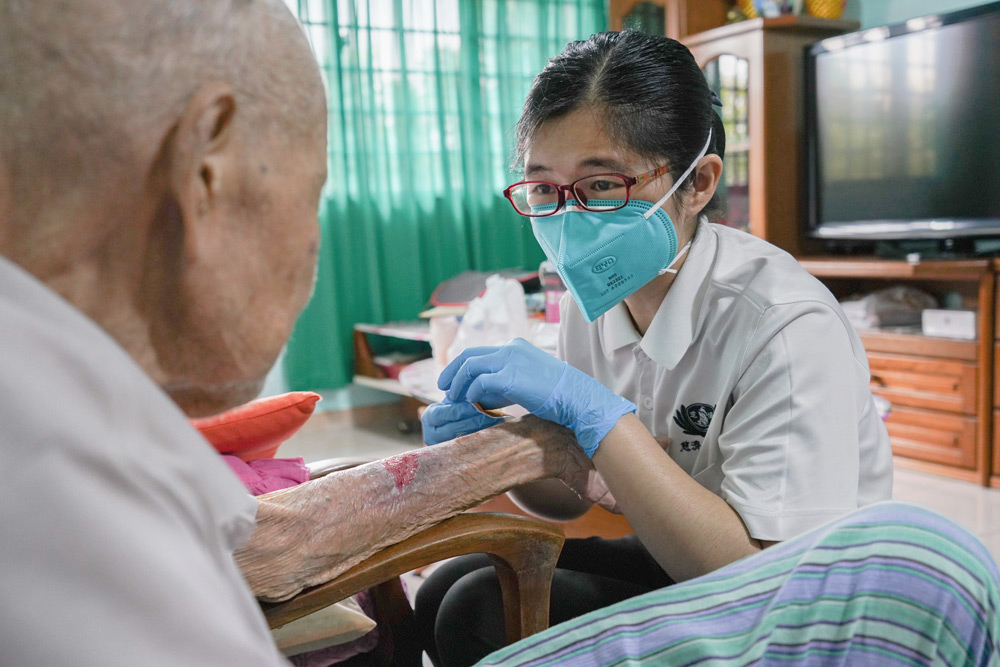 Before setting off to visit the patient, she would check that her trolley case is fully stocked with the required drugs and medical tools. Whether rain or shine, Ms Choo always arrives on time and spends an average of one hour per household for nursing services such as wound care, general health checks, changing nasogastric tubes, medication injections, and changing urine bags.