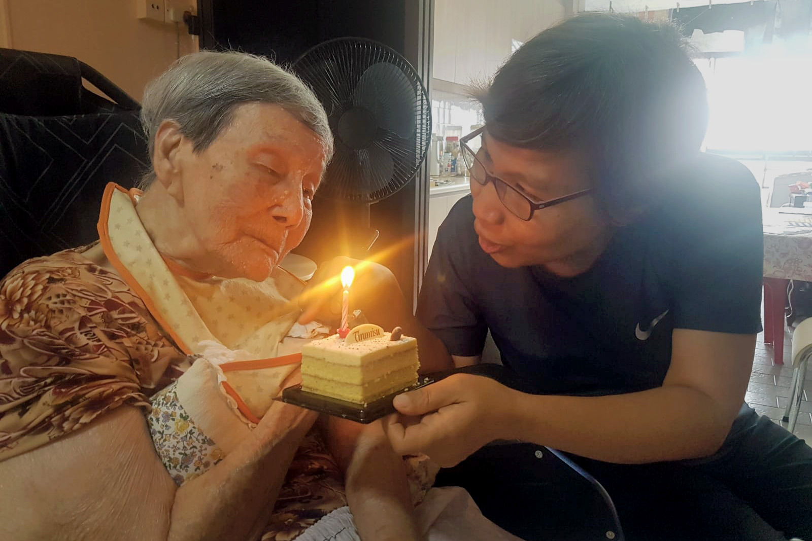 In 2022, Tin Tin (right) and everyone celebrated Madam Koh’s birthday (left) with a cake bought by Madam Koh’s daughter. (Photo by Pan Han Ni)